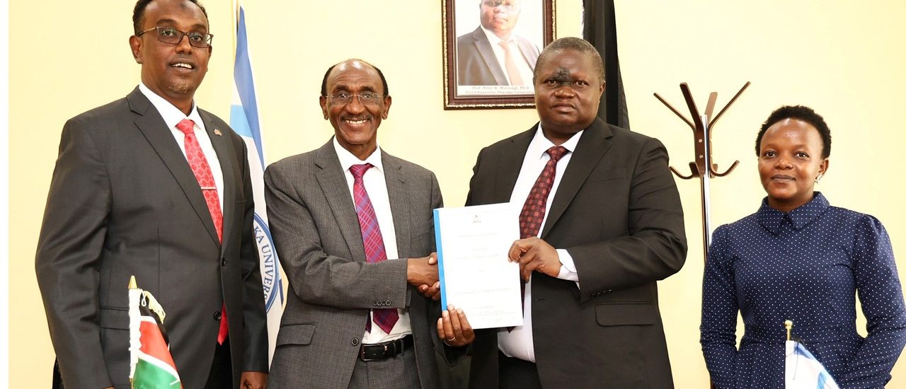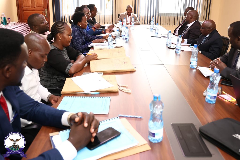 Tharaka University (TUN), Vice-Chancellor & CEO, Prof. Peter K. Muriungi, received guests from the Public Service Performance Management Unit, under the Office of the President, who paid a courtesy visit ahead of the annual performance contract evaluation for the 2024/2025 financial year. The team was led by Mr Robert Ngei, Director of Economic Planning and Performance, and Ms Melody Nyongesa, Assistant Director of Economic Planning and Performance.