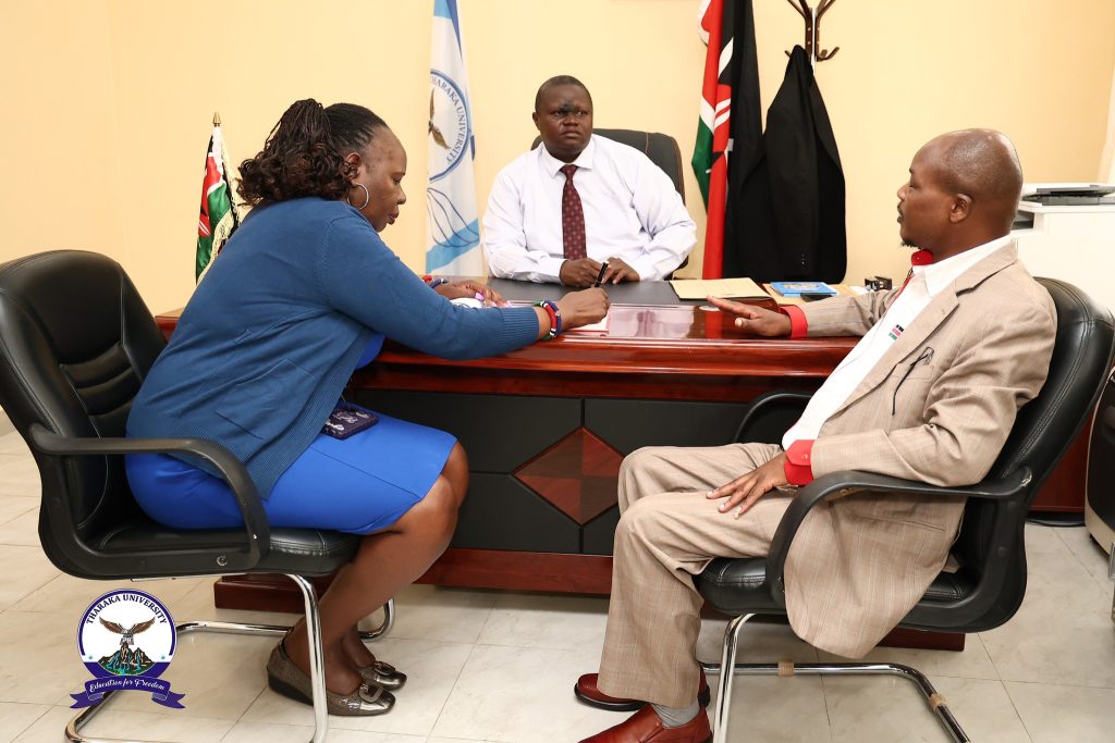 Tharaka University (TUN), Vice-Chancellor & CEO, Prof. Peter K. Muriungi, received guests from the Public Service Performance Management Unit, under the Office of the President, who paid a courtesy visit ahead of the annual performance contract evaluation for the 2024/2025 financial year. The team was led by Mr Robert Ngei, Director of Economic Planning and Performance, and Ms Melody Nyongesa, Assistant Director of Economic Planning and Performance.