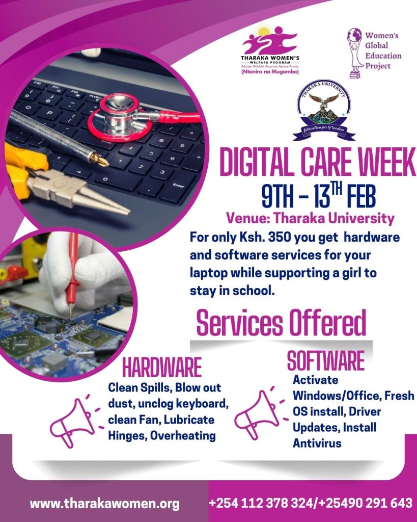 Through an existing partnership and a Memorandum of Understanding (MOU) between Tharaka University, the Tharaka Women’s Welfare Program, and the Women’s Global Education Project, Tharaka University will be hosting Digital Care Week from 9th to 13th February at the University. The initiative combines affordable laptop care services with social impact, supporting education while promoting digital well-being.