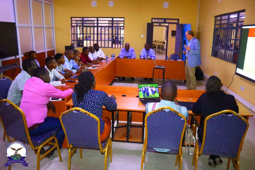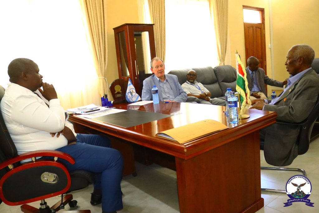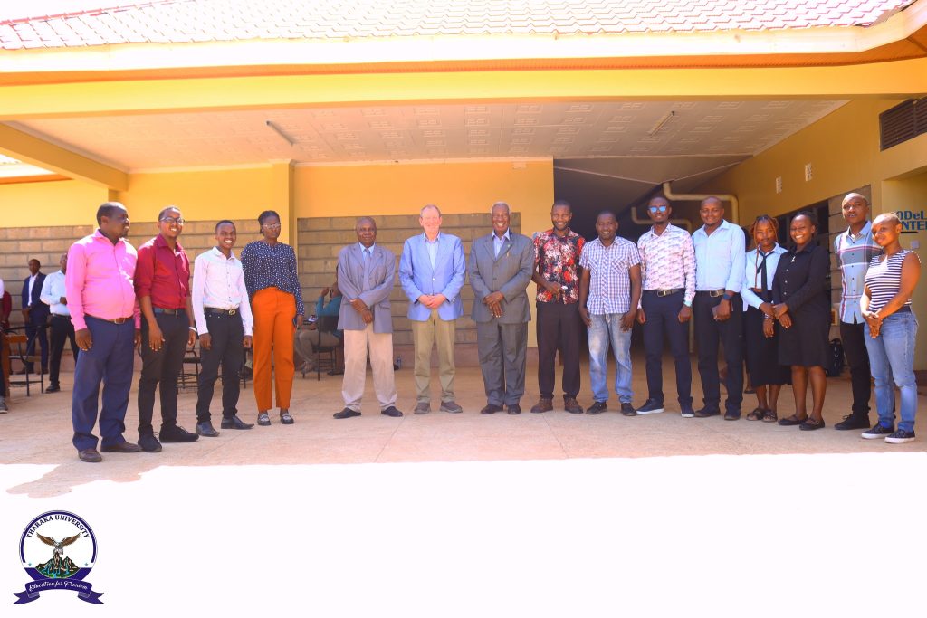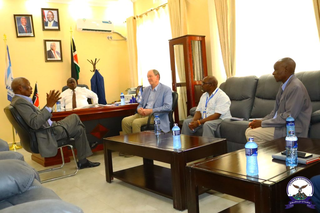 Tharaka University (TUN) Vice Chancellor & CEO, Prof. Peter K. Muriungi, received Prof. Curtis R. Youngs, a Morrill Professor of Animal Science at Iowa State University, USA, who paid a courtesy call to the office of the Vice Chancellor alongside the TUN Chancellor, Prof. Emeritus Ratemo W. Michieka. During the courtesy call, they held discussions on potential areas of collaboration in agriculture, research, smart agriculture, innovation, and capacity building. Prof. Curtis R. Youngs, who also holds the M.E. Ensminger Endowed Chair of International Animal Agriculture, later delivered a special lecture to Master’s students on the topic: ‘Assisted Reproductive Technologies for Sustainable Production of Meat and Milk.’ The session provided valuable insights into the role of advanced reproductive technologies in improving livestock productivity, promoting sustainable meat and milk production, and strengthening food security. Tomorrow afternoon, Prof. Curtis R. Youngs is expected to give a public lecture to students, staff, and community members focusing on the “Role of Animal-Source Foods in a Healthy Balanced Diet for Humans.” Themed at ‘Global Food Security and Sustainable Animal Production.’ The lecture is organized under the directorate of the Center for Smart Agriculture, led by Prof. Levi Musalia, Ph.D. Present were University Council Chair, Prof. Peter N. Keiyoro, Dr. Collins Sitienei, Director of Linkages and Partnerships, Dr. Urbanus Ndolo, Director of Resource Mobilization and University Advancement, and Mr. Dennis Kibungi, Director of Farm, Buildings, and University Enterprises. The visit marked an important step in strengthening academic engagement and knowledge exchange in support of smart and sustainable agriculture as a niche area at TUN.