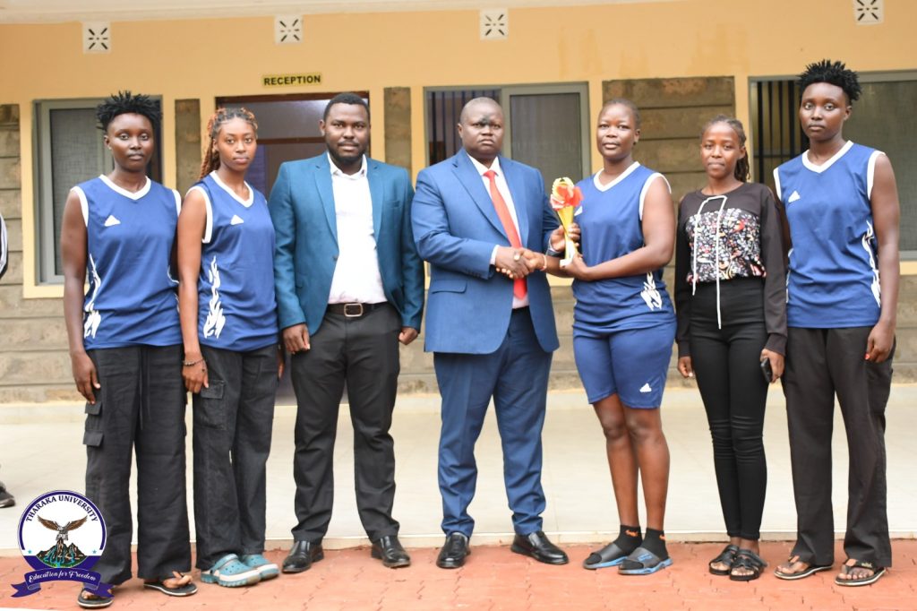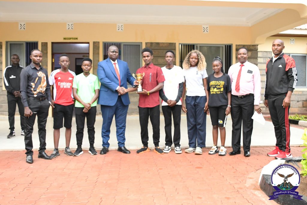 Tharaka University (TUN) today celebrated a proud sporting milestone as trophies and medals won by various teams were officially presented to the Vice Chancellor/CEO, Prof. Peter K. Muriungi, by the University’s Games and Sports Department.
